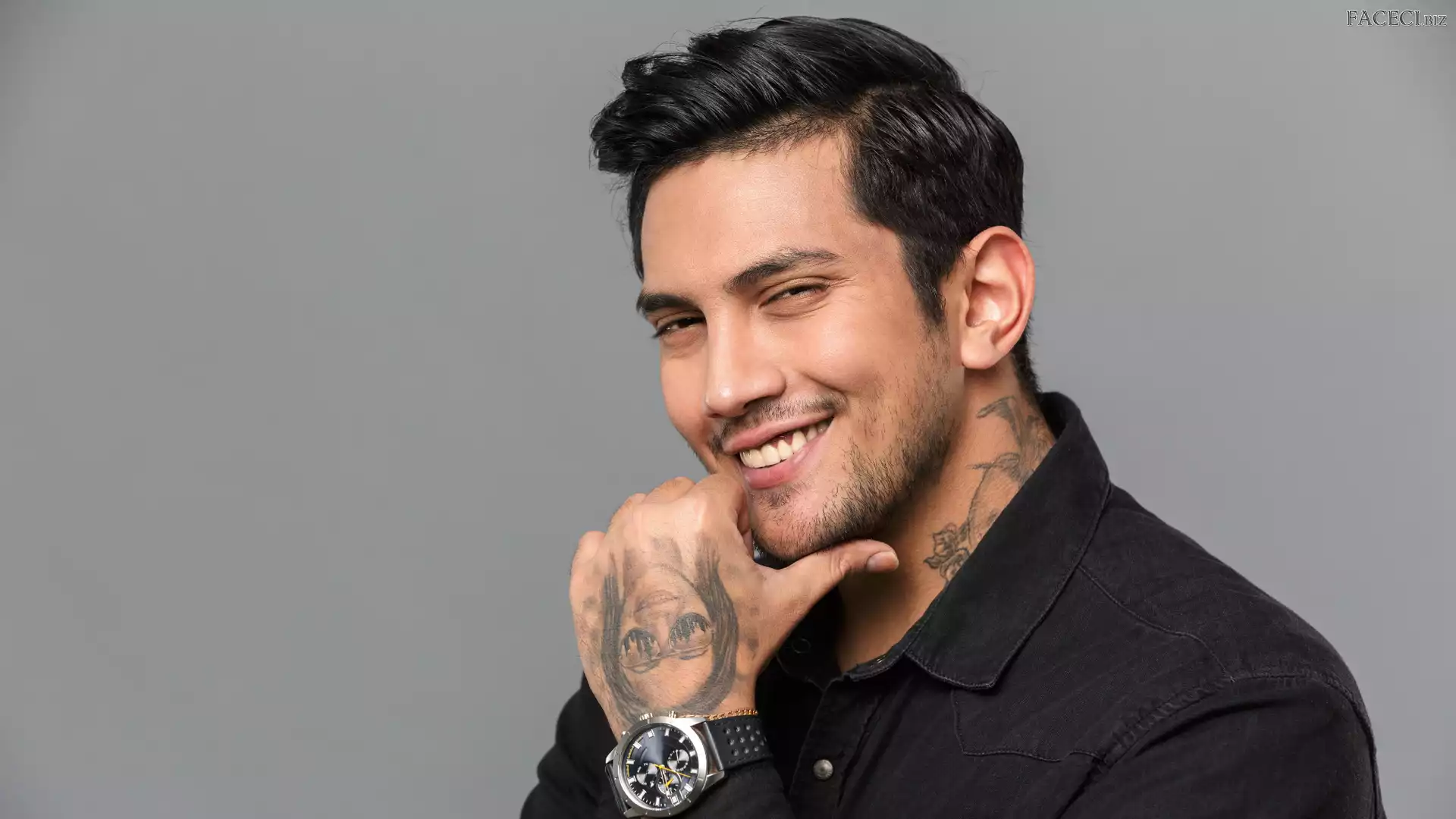 Tatuaże, Uśmiech, Mężczyzna, Koszula, Zegarek, Brunet, Czarna - faceci.biz